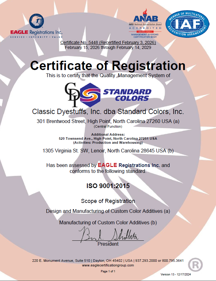 Standard Colors, Inc. has earned ISO 9001:2015 Certification after successfully completing an independent audit of its Quality Management System (QMS) by Eagle Registrations, Inc. of Dayton, Ohio.